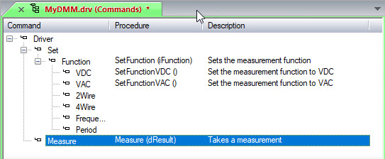 A command item becomes a command only after you attach a procedure or an I/O Table. Since the driver MyDMM uses I/O Tables, attach them to its command items.