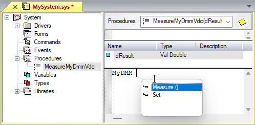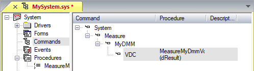 Before you can employ System commands, you need to create a System Procedure. In this example, you will create a procedure named MeasureMyDmmVdc(dResult). The procedure will call two commands defined in the MyDMM driver.