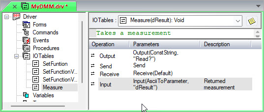 This I/O Table is now complete. When called, ATEasy first sends a string (:READ?) to the DMM and then reads back data and converts the data from ASCII to the parameter dResult of type double.
