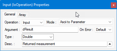5. Create another operation and change the operation type to Input. Leave the Mode as ASCII to Parameter, which causes ATEasy to convert ASCII data in the buffer to the parameter type you select. Enter dResult in the Argument. The parameter type should be set to Double by default. Enter the description of the parameter as: Returned measurement. The Input properties window should look like the following: