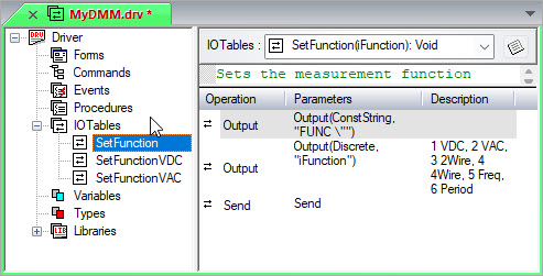 You have created a single I/O table to handle all the DMM measurement functions. When this I/O Table is called with a parameter of 1, the DMM will be set to VDC; when 2 is the argument, the DMM will be set to VAC; and so forth.