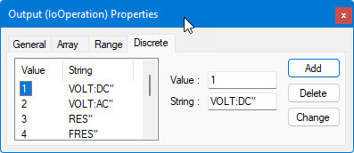 6. Select the Discrete page of the Output properties. This page contains a cross-reference table for multiple I/O Table discrete values. You can enter a different string for each value and when the I/O table is called with a specific value, the corresponding string will be sent to the instrument.