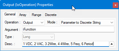 While you could continue to add individual I/O tables for each of the DMM functions, ATEasy offers another method to further simplify driver development. One of the property pages for an Output operation is Discrete. The Discrete mode allows a single I/O Table to accommodate multiple options which typically require multiple I/O Tables. In this example, you will create a single I/O Table allowing you to set the measurement mode of the DMM to any of the available functions.