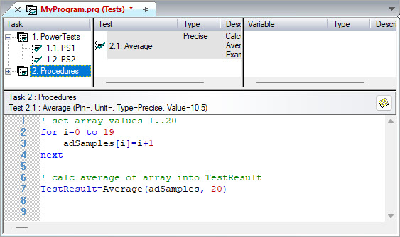 The first three statements in this example are a simple For-Next loop filling the array, adSamples. The next line calls the average statement and sets the result to be the test result. Note that you could call the Average procedure by omitting the second optional argument (TestResult=Average(adSamples)), since you are calculating the average of the entire array.