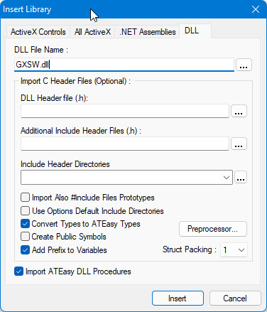 Once the library is added to the driver, you need to define the procedures residing in the DLL since a DLL does not contain type information about its procedures. To define these procedures, you need to look into the DLL documentation or use the C programming language header file that is sometimes provided with the DLL. Your next step will be to declare the procedures under the library you just inserted. Before you start, let’s look at the GXSW.DLL header file.