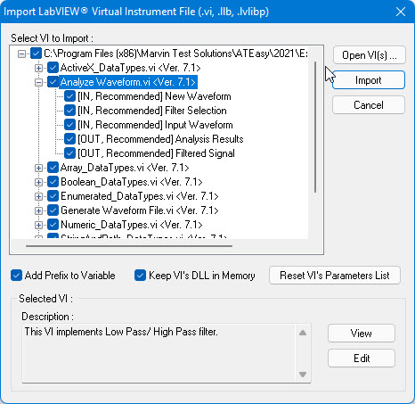 ATEasy allows you to use National Instruments LabVIEW® Virtual Instrument Files from within your application. The two available file types are supported: VI file that holds a single Virtual Instrument panel and LLB that holds multiple VIs.