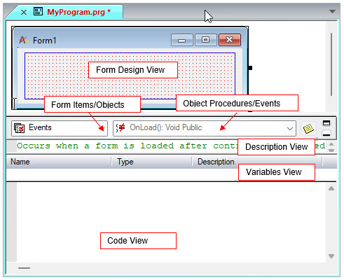 The area below the form design view displays two drop-down lists. The left drop-down list shows the Form Items that can be edited including the form events, procedures, and variables, as well as the controls and menus included in the form. Selecting an item from the Items drop-down list will refresh the second drop-down list and displays the procedures of the selected item. Selecting a procedure from the Procedures combo box makes that procedure the current procedure.