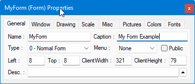 The form's properties window has several pages defining the different aspects of the form. The most important elements are found on the General page. Here, the Form Name and type are defined as well as the form's caption, default menu bar, size and whether the form is public (that is, can be used by other modules)