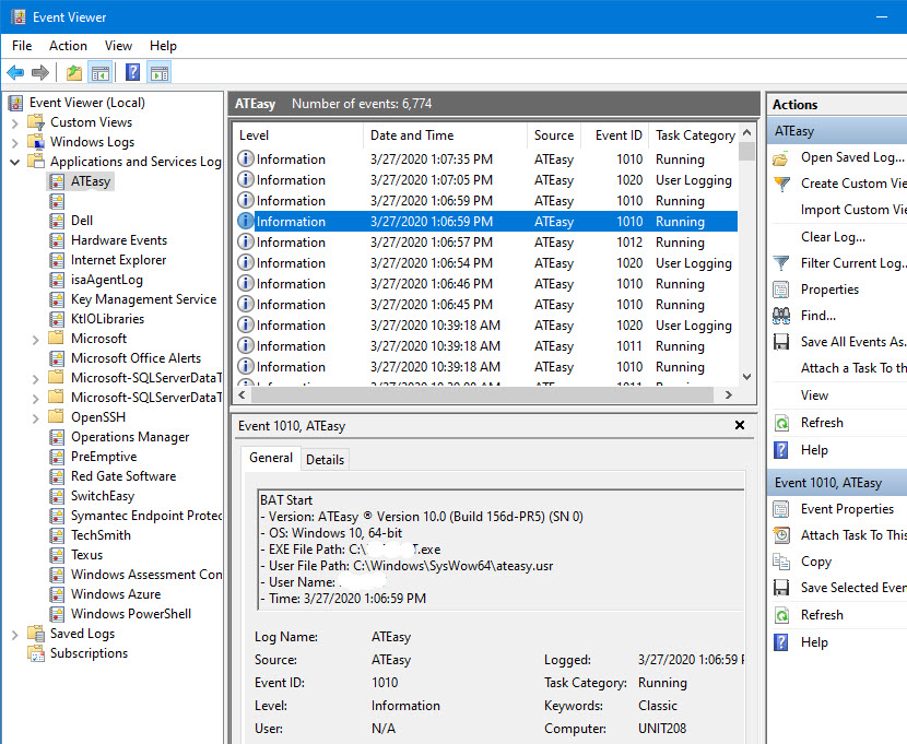 ATEasy logs event records when certain events occurs. The events are recorded in Windows Event Log and can viewed using the Windows Event Viewer application. To view the events records, open the Windows search and search for Event Viewer. Next expand the Application and Services Logs and select ATEasy as shown here: