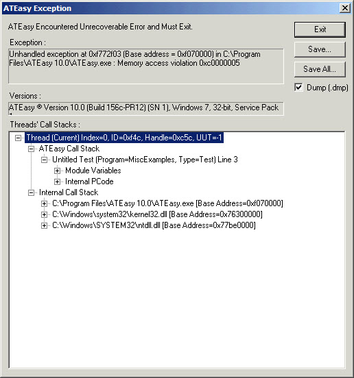Normally, ATEasy catches several common exceptions and attempts to notify the user without allowing the application to crash. This protection does not generally extend to external libraries such as DLLs, COM/ActiveX or .NET assemblies that are called by your ATEasy application. Common cause of these exceptions are: