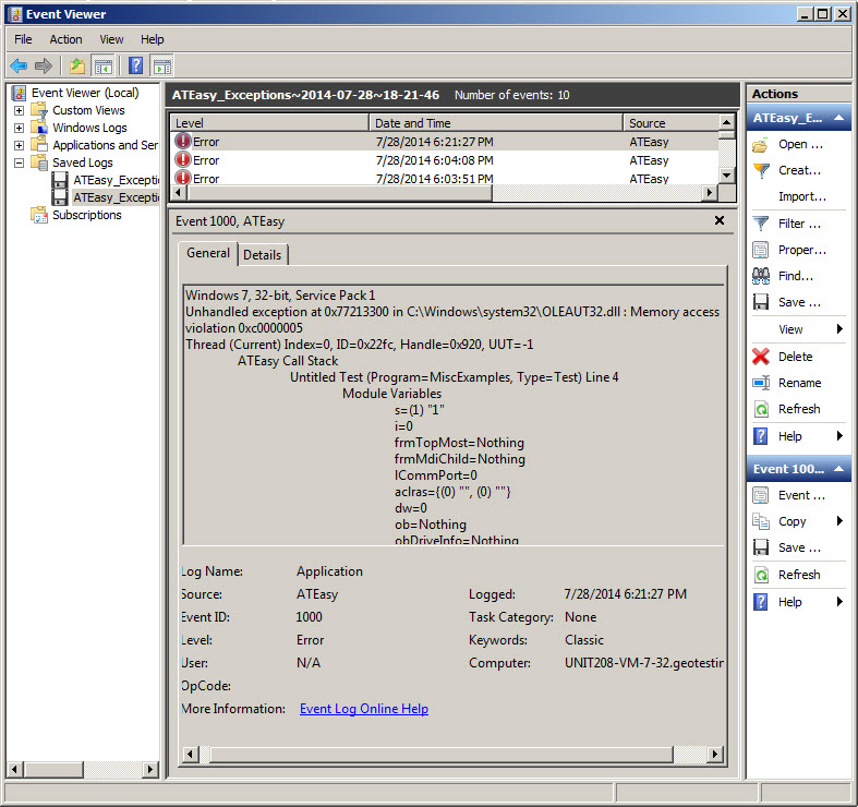 The information is also saved to the Windows Application Event Log. If you still require assistance with analyzing the crash, you can send Marvin Test Solutions the Windows Application Event Log filtered for ATEasy events from the Windows Events Viewer: