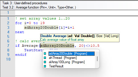When you enter a procedure, at each its parameter, a list of possible arguments will be displayed to help you write code for the procedure or function. In the following example, the average function's first parameter's suggestions are listed along with the parameter information.
