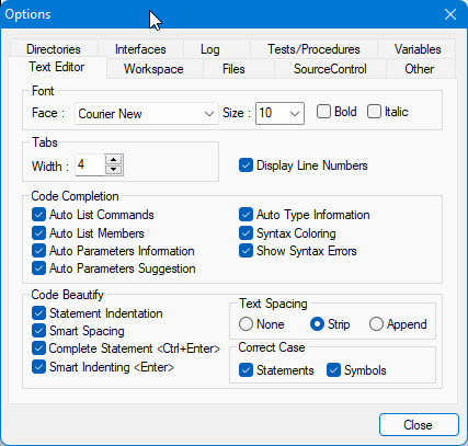 6. Correct Case: Options are Statements - when checked all statements are set to lower case (i.e. If will change to if, etc.), Symbols - set the symbols (procedure, variables, commands, etc) case according to its definition (testresult will change to TestResult). Default: both are checked.