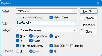 When Skip Internal Library is checked, the search will skip the Internal library - skip every items in the Internal library, causing the search faster. This is only used when using the Find Next button since you cannot replace internal library items.