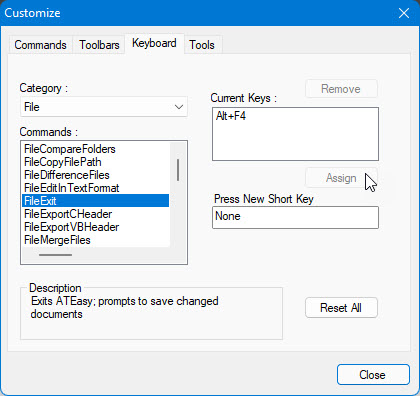 To assign this key combination to the selected command, click the Assign button. The key names appear in the Current Keys box.