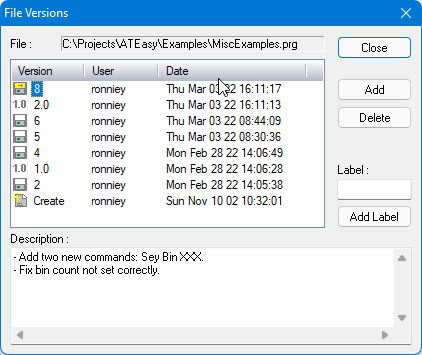 Use the versions feature to save versions of ATEasy files. You can use versions when several programmers are working on the same ATEasy project and you need to track their work, or when you want to track the changes in your own work.