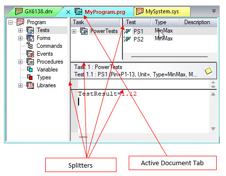 Tabbed Document windows are windows that are displayed within the Client area. They show the Document view which displays the Program, System, or Driver documents, or any of the dockable windows in the Tabbed Document state. They frequently contain Splitter bars to organize window information. You can close the tab by clicking on the X button. The Active Tab is the tab that is caption appears in red/bold.