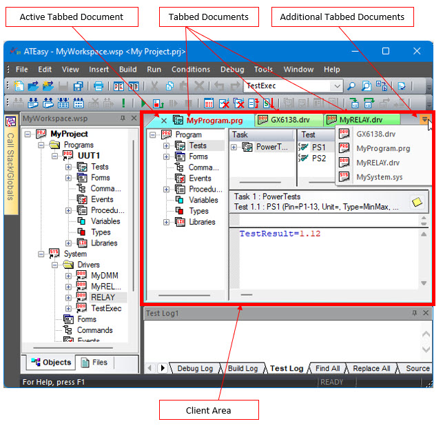 You perform much of your work in the Client area, which is shown in Using the Integrated Development Environment. ATEasy uses this area to display Tabbed Document Windows which are either the Document frame or Dockable windows in the tabbed state. For more information on these windows, see Organizing the IDE.
