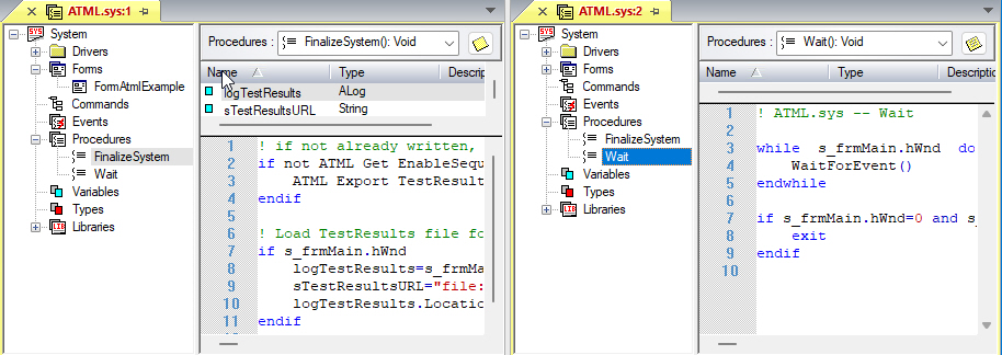 The example above shows three tabs (MyProgram.prg, TestExcec.drv and MySystem.sys), The Active Window tab is MyProgram.prg. Additional tabs can be activate by selecting them from the drop list on the right.