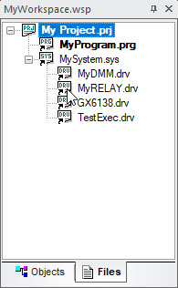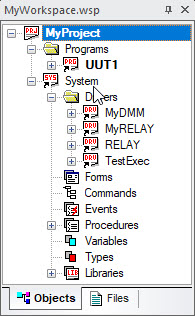 The Workspace window displays the contents of the current workspace file in a tree-like view. This window contains two tabs: Objects and Files. The Objects tree view (shown top) displays all files' objects opened by the IDE: project files, modules such as drivers, system or programs, and their sub modules such as procedures, and variables. The Files Tab is used to display the current workspace project and module files without showing the files sub modules (shown below). The Workspace window displays objects representing document shortcuts and objects opened in the IDE. Though it initially appears to the left of the IDE as a dockable window, as explained in Using the Integrated Development Environment, you can display the Workspace window in the Client area as a MDI, as explained in Dockable Windows. For information on document shortcuts, see Shortcuts, Documents, and their Properties. For information on the Workspace file, whose objects appear displayed in the Workspace window, see Workspace File. The workspace displays a tree (Objects Tree view) that contains a hierarchical list of objects that belong to the document being loaded by ATEasy. Each object is displayed with an icon showing its type and name. For more information, see Overview of Trees and Objects. Files view only displays files (documents) that belong to each project in the current workspace. The user can perform editing/inserting commands on the objects displayed in the tree. Double-clicking on an object/file opens the document view used to display and edit the object/file. When ATEasy exits, the current display tab and its current selection will be remembered, and shown as they left. The name of the current active project, displayed Bold, will be saved upon ATEasy Exit, and when ATEasy starts, it will be expanded to show objects/files belonging to the project. in ATEasy 2025, v14, the Workspace Window can contains folders that can organize your application projects or file to folders as shown below: |