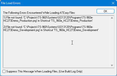 This option when unchecked, causes the ATEasy Load Errors Dialog to be displayed when ATEasy loads files (e.g. when ATEasy opens a workspace file) and errors such as missing ActiveX/,Net library or missing workspace file is encountered. The dialog displays an accumulated errors occurred while loading files and it replaces the error message box that was displayed for each error that encountered during file loading in older version of ATEasy. Default: Unchecked.