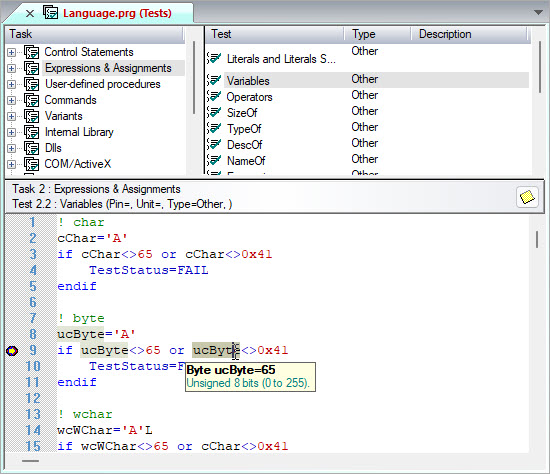 The debugging tools provided by ATEasy allow users to test any portion of the program without compiling the application. This ability saves a significant amount of time as each line of code may be executed individually and immediately verifying the validity of the code as it is created.