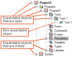 A Tree view lists the following kinds of objects: ● Expandable objects - equivalent