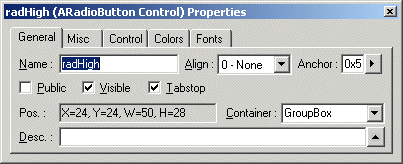 In particular, ARadioButton controls are often used in a group from which the user selects only one of several options. ARadioButton controls are grouped by drawing them inside a container -- namely, a GroupBox control. To do this, draw the AGroupBox first and then draw the ARadioButton controls inside. All ARadioButton controls within the same container act as a single group - the Container property in the property page will be set to the GroupBox name for all of them: