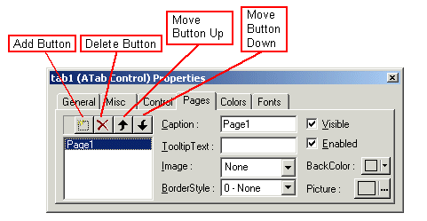 Create multiple pages using the Add button - for each button, enter appropriate Caption, the name of the page, and other properties. User Delete button to delete a page and Move buttons to switch the order of tab pages.