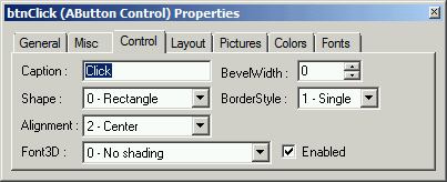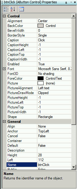 Here, the Caption is "Click", the Name is "btnClick", and the Shape is "0 - Rectangle."