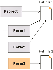 You can link a Help file from both the Project and Form modules. If a Help file is not specified from within the Forms Properties window, the project Help file is used. If a Help file is specified from within the Forms Properties window, it will be used to display Help rather than the project Help file. Forms 1 and 2 use the project Help file. Form 3 uses its own Help file. |