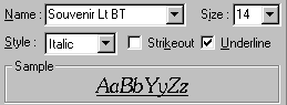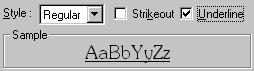 The Sample display shows an example of the current font. The properties include the font Name, Size, Style, and modifiers Strikeout and Underline.