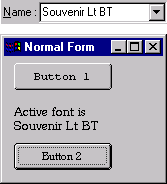 During design time, the form's active font is changed to Souvenir Lt BT and a new button is added to the form. Button 2 inherits and uses the form's current active font, Souvenir Lt BT. Button 1 continues to use Courier New. During run time, the DrawText commands use the form's current active font, Souvenir Lt BT. |