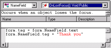 This is the code used to copy the data entered into the TextBox (form.NameField.text) to the TextBox tag field (form.NameField.tag):