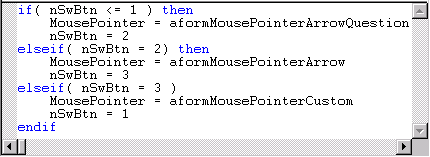 Under program control, you can select one of 16 mouse cursor images to display on your form. One of the mouse cursor image selections is reserved for a custom cursor (aformMousePointerArrowCustom).