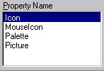 The Property Name list displays all properties that can be changed. The picture properties include the Icon image, Mouse Icon image, Palette image, and Picture image. |