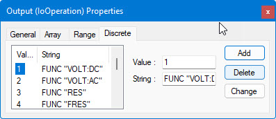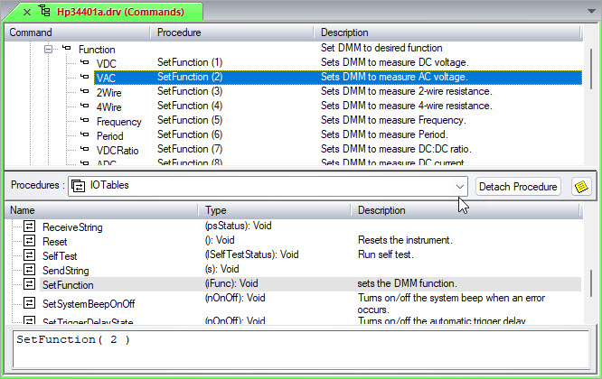 This example uses a single I/O Table (SetFunction) to set the measurement mode of the DMM to any of the available functions: