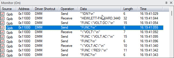 Use the Monitor window to view the actual communication between ATEasy and the instruments it controls. You can select the interfaces for which you want to view the actual communication between ATEasy and the instruments it controls. Depending on which interfaces you select, when you run a program the Monitor window displays the GPIB, RS232, VXI, and other strings sent or received by ATEasy.