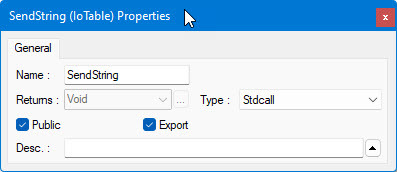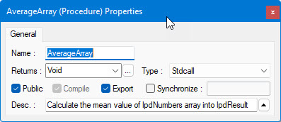 When you check the Export flag, the export procedure calling type combo box will appear and allow you to select either Stdcall or CDecl. These calling conventions for exported functions allows for ATEasy DLL to support programming languages that use Stdcall or CDecl.