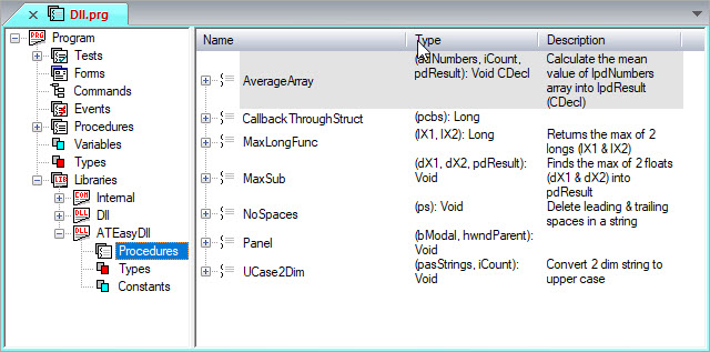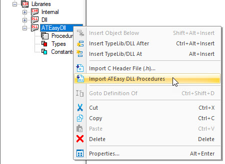 Additionally, you can also re-import ATEasy procedures and types via new Insert command, "Import ATEasy DLL procedures". If any of procedures/types exist, they will be replaced and new or deleted procedures will be inserted/removed. The same command is also available in the context menu for the DLL:
