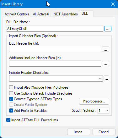 First you need to insert the ATEasy DLL into your current project. Open the Insert Library dialog and select the DLL page: