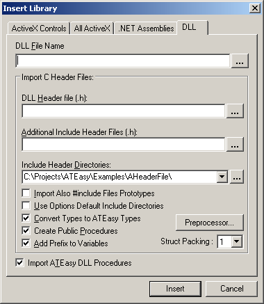 For the description of Import C Header Files: section, see Importing DLL Functions and Data Types from C Header Files.