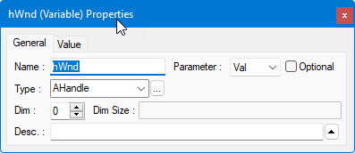 Specify the parameter's name, type, dimension, dimension size, and description. For more information on these properties, see Variables Properties Window. Note that DLL procedure parameters can be defined as type Any, which accepts any data type.