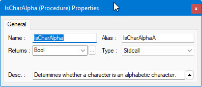 The Windows User32.DLL IsCharAlpha function determines whether a character is alphabetical. The IsCharAlpha function has two versions: IsCharAlphaA (ANSI) and IsCharAlphaW (Unicode). If you wanted to declare the IsCharAlphaA function in your application but did not want to have to enter the "A" suffix in your code each time that you called the function, you could set an alias in the procedure's Properties window as shown below: