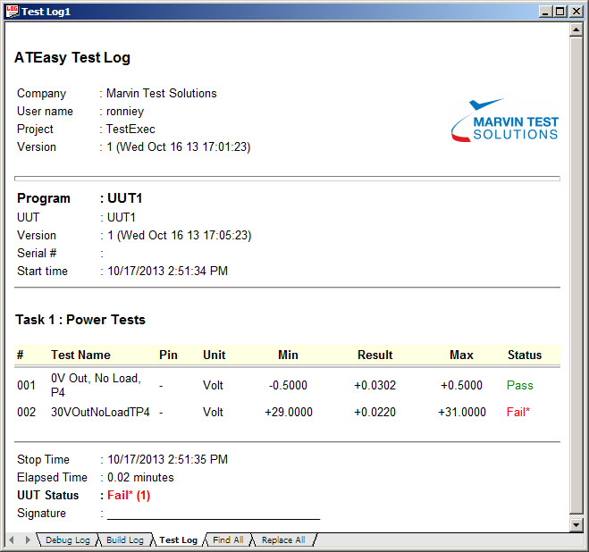 The Test Log Tab displays the test data or results generated by ATEasy when a program is running. It also displays any information that you route to the Test Log by using the Print Statement in your application code. The Test Log has two formats: Text, in which plain text is displayed; and HTML, in which text, tables and pictures can be displayed. In the illustration above, a test log is displayed in HTML format. For instructions on viewing the Test Log in text and HTML, see Logging Test Results.