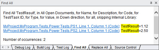 Click to find all occurrences and to select the first one. The found items links are shown in the Find All Log Window and are displays as links allowing you to navigate and view the found text.