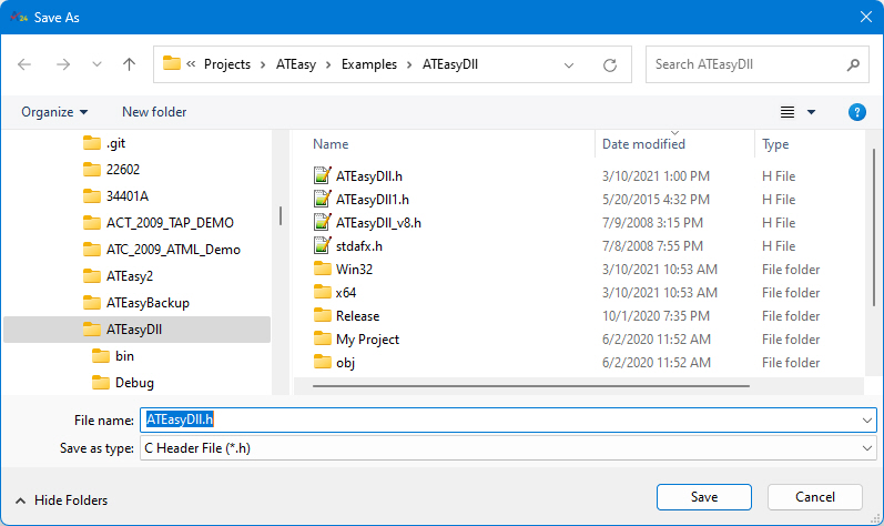 Initially the resulting header file name was set to the same file name as the DLL file name which is specified in the ATEasy DLL Project property window and the extension follows the menu selection either .h or .vb. You change the header file name in the File Save As dialog,