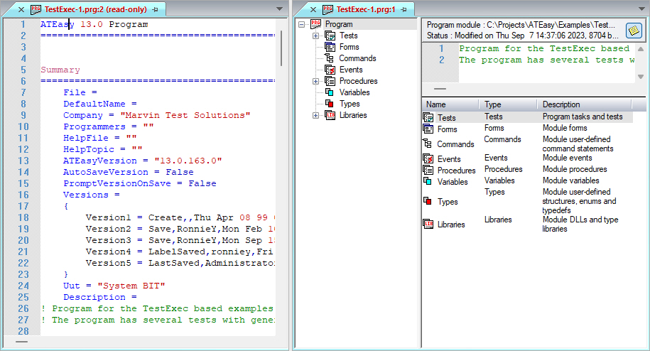 The following image shows a program in text format (left window) and in binary format (right window), the left window is in read-only mode since View and not Edit in text mode command was invoked: