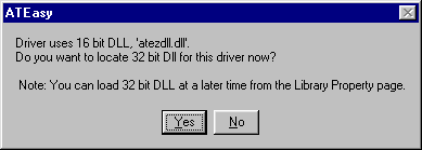 The new ATEasy does not support 16-bit DLLs. If your .INS driver (with the exception of ATEZUSER) uses a 16-bit DLL, you will have to replace it with a 32-bit DLL. If you have the source code for the 16-bit DLL, recompile it as a 32-bit DLL. If you do not have the source code, contact the vendor who supplied the 16-DLL to obtain a 32-bit version. Below is the warning box you get when you try to load and convert an .INS driver based on a 16-bit DLL..