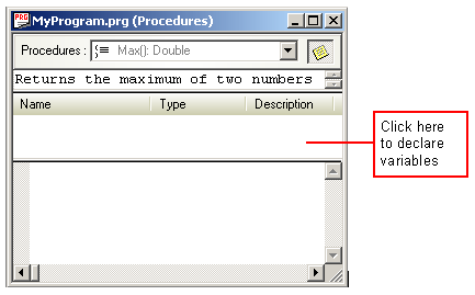 You can declare Procedure variables in the Variables View of the Procedures View window.